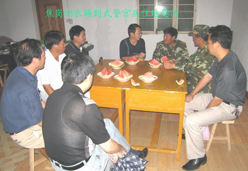 7月22日上午8时,在集团公司副总经理刘超带领下,焦岗湖农场领导专程赶赴省武警官兵暂驻地鲁口中心小学,为他们送上600斤猪肉和土豆、西瓜、苹果、香蕉等慰问品,以示感谢。