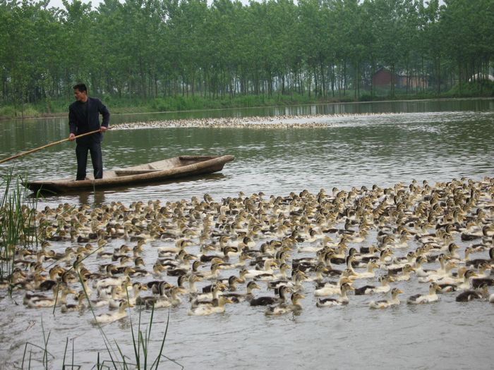 图为养殖专业户周文金正在鱼塘里放养麻鸭。