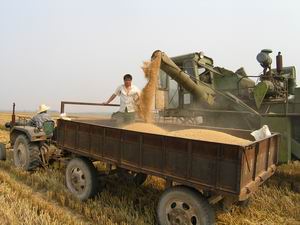 近年来,潘村湖农场积极推广和运用农业新品种、 新技术取得明显成效。去年秋种时,该场在二分场 推广小麦新品种——皖宿9908并实行精量播种,每 亩播量只有4.25公斤。在家庭农场职工和农技人员 的共同努力下,播种新品种、采取新农艺的2000亩 小麦喜获丰收,最高单产达到460公斤。加上种子部 门给予的加价补贴,每亩产值最高可实现800元。图 为职工喜收丰收粮的情景。(杨登宏)