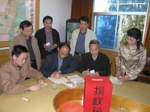 砀山果园场的灾情牵动着潘村湖农场广大干群的 心。连日来,全场上下一个向兄弟农场献爱心、送 温暖的活动热潮方兴未艾。无论是各级领导、管理 人员,还是一线职工、离退休老同志,纷纷慷慨解 囊,踊跃认捐。图为机关工会开展捐款活动的情 景。(杨登宏)