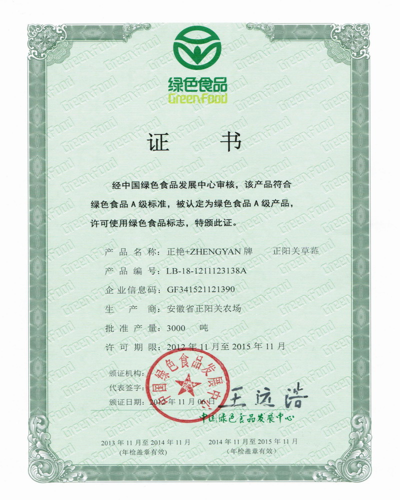 近日,安徽农垦正阳关农场生产的“正艳”牌草莓,经中国绿色食品发展中心审核认定为绿色食品A级产品,并颁发了证书。
